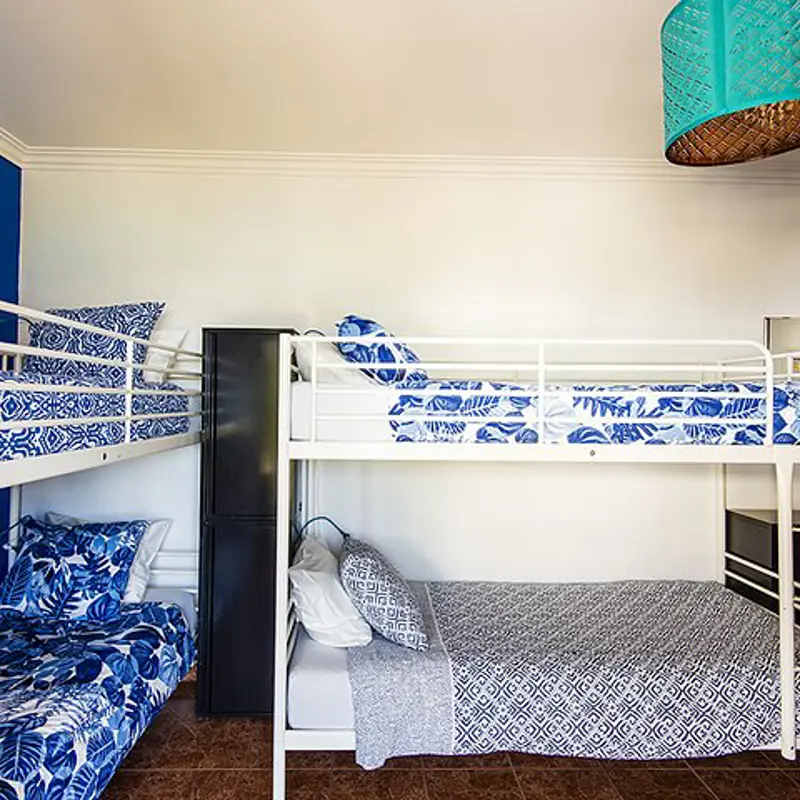 This room celebrates Marge Calhoun and her daughters. Marge was the first female world champion, and her daughters, Robin & Candy, following her mother's footsteps, becoming surfing icons. This room, located on the ground floor, has one comfy bunk, plus a single bed, ideal for three. You can find private lockers and plenty of space to make it home for the week. Exterior bathroom, shared with one other room.