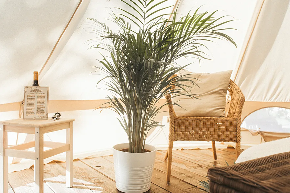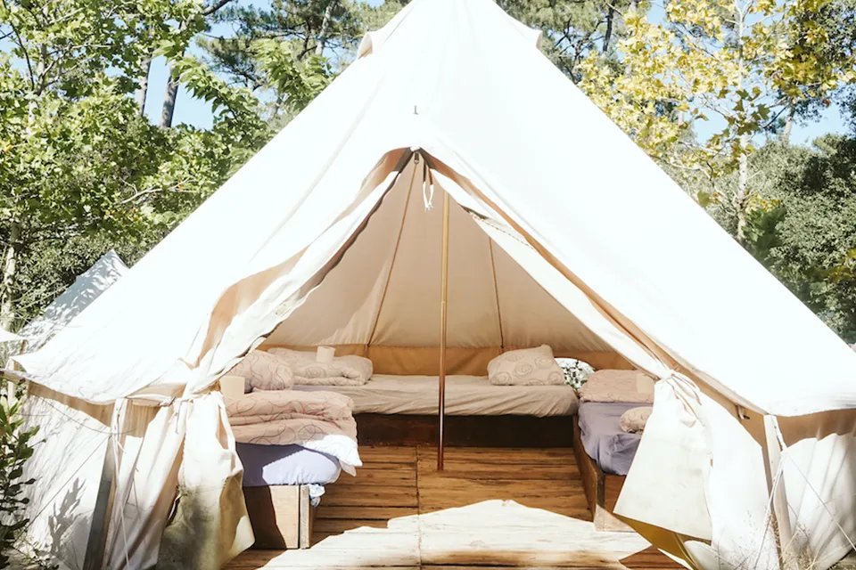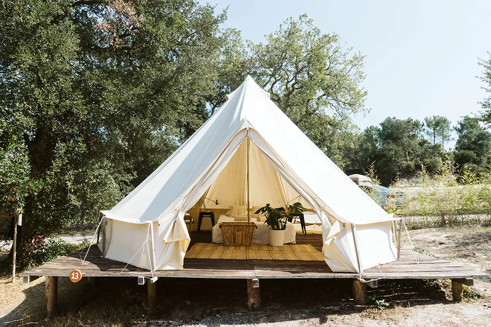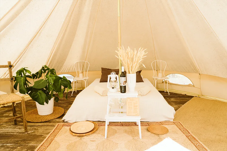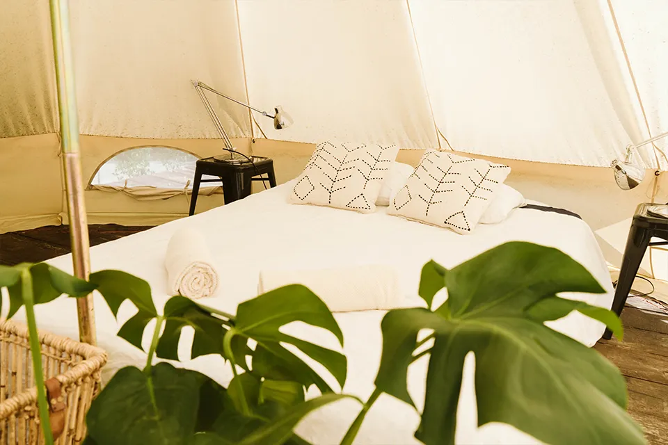 Glamping tents include bedding and towels, power and lighting, and access to a dining and bathroom area,