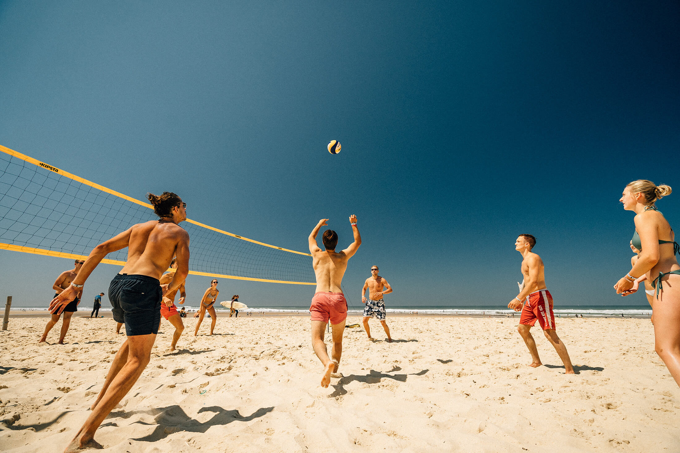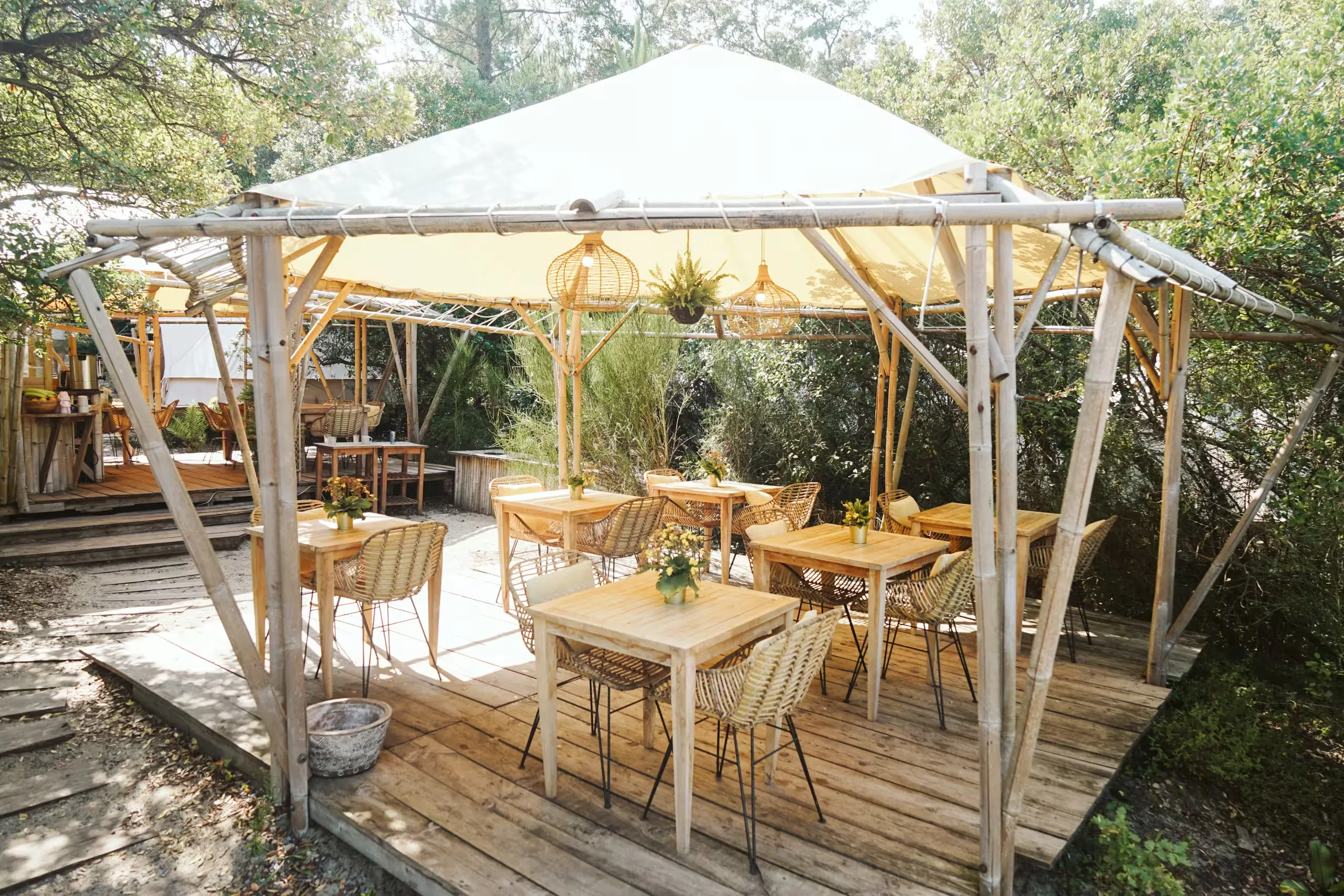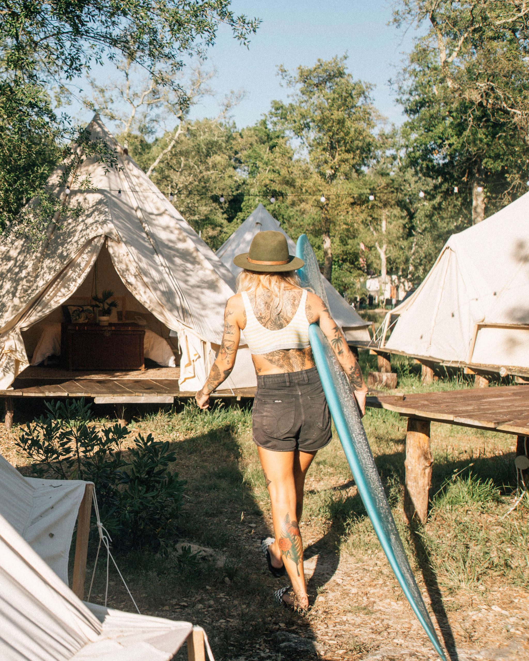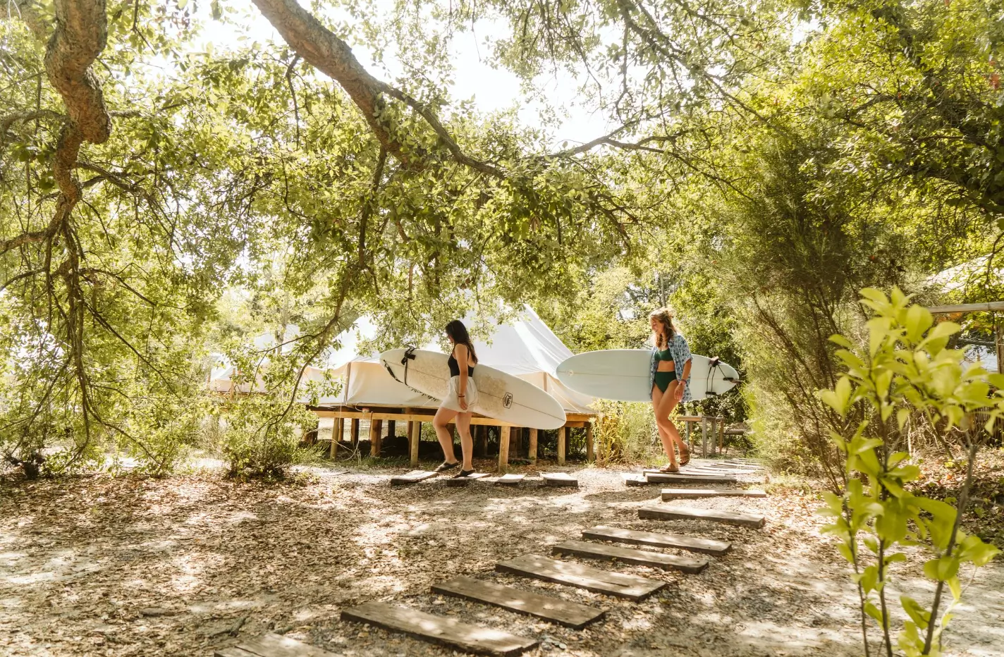This is a proper “Landes coast” week: sandy paths through the pines, dunes opening out to the ocean, and enough space to breathe even when the camp is buzzing. Days tend to fall into a good rhythm: breakfast, surf plans, time in the water, then chilled afternoons back at camp or out exploring.