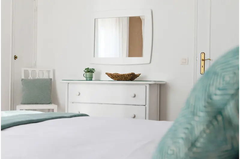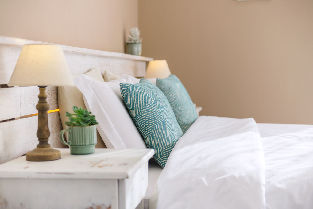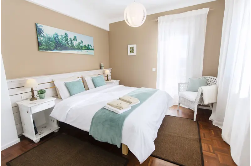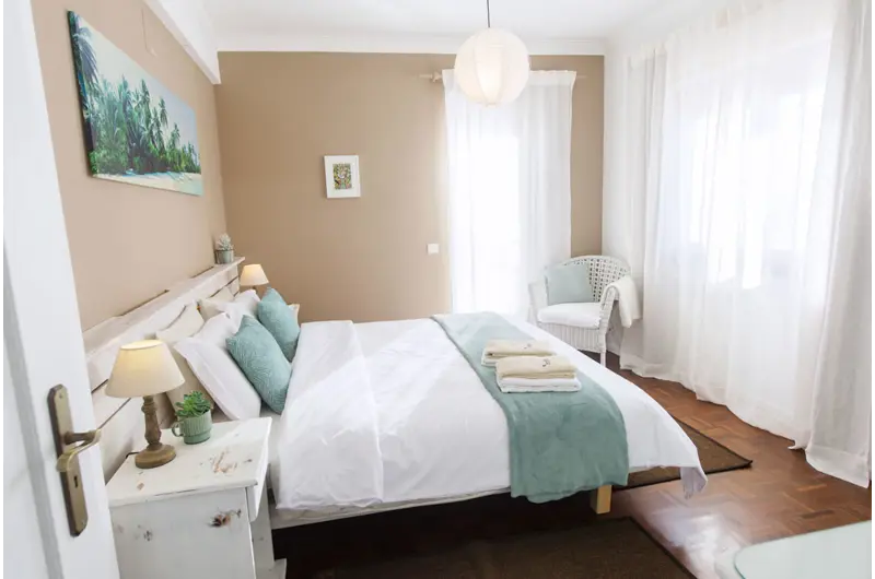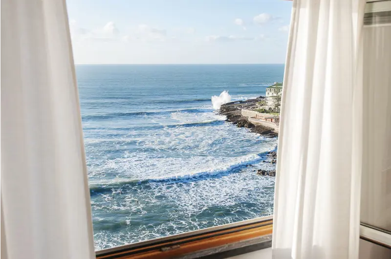 “Jersey” is a double or twin sea view room with an incredible view over Ericeira’s iconic bay, Praia do Sul. It features a shared bathroom, and storage unit.