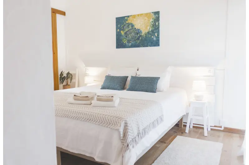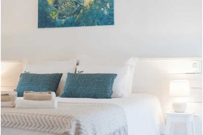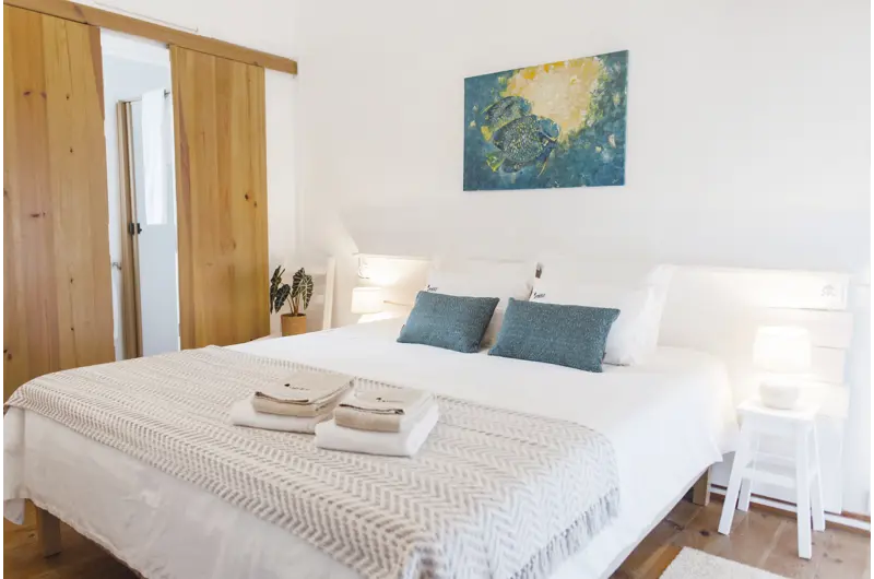 “Sunset Ensuite“, offers a wall wardrobe and a large sea view window with direct access to the property garden, tennis court and swimming pool.