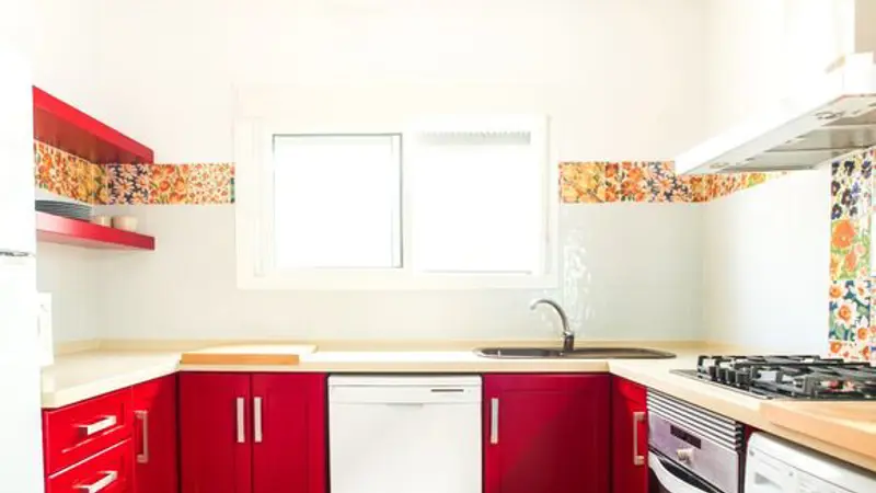- Kitchen with stove, refrigerator, microwave, washing machine