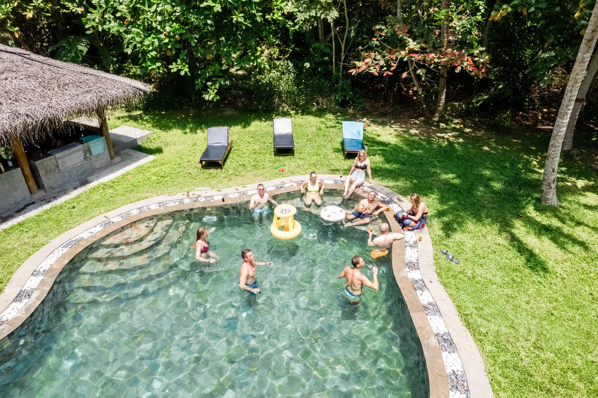 The villa is has 10 high standard comfortable bedrooms with private bathrooms, hot well working showers and A/C. We offer a large pool of 11 x 5 meters, a large yoga area of 70m2, outdoor Cinema, board storage, garden and a luxury open kitchen where you can see our inhouse chefs prepare daily the tasty dinners.